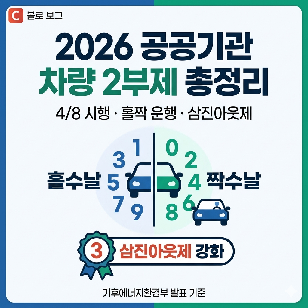 이번 2부제는 3월 25일부터 강화 시행 중이던 공공기관 승용차 5부제를 한층 더 강화한 것으로, 기후에너지환경부가 주관합니다.